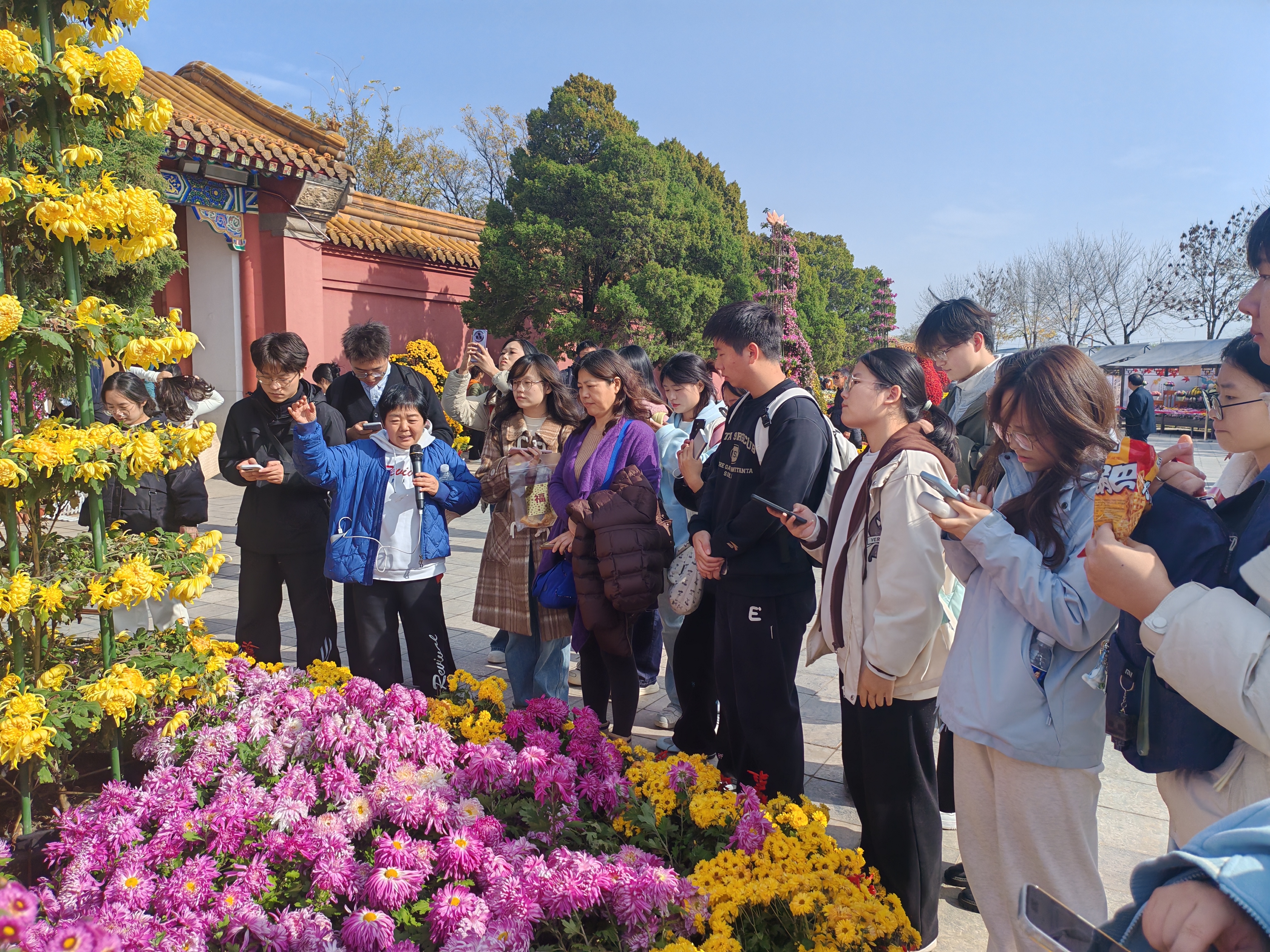 龙亭公园作为中国菊花文化的重要承载地,恰逢第43届中国开封菊花文化节与第十五届中国菊花展览会同时举办,园内40万盆精品菊花与数千个珍稀品种竞相绽放,为本次实习提供了得天独厚的学习环境。漫步其中,同学们欣赏到了“荷包蛋”的灵动、“方便面”的别致、“朱迪”的精巧等特色艺菊,这些菊花与古色古香的宋式建筑交相辉映,生动展现了“菊韵宋风”的深厚文化底蕴。这场集观赏体验、文化传承与科技展示于一体的国家级菊艺盛会,让同学们大开眼界。