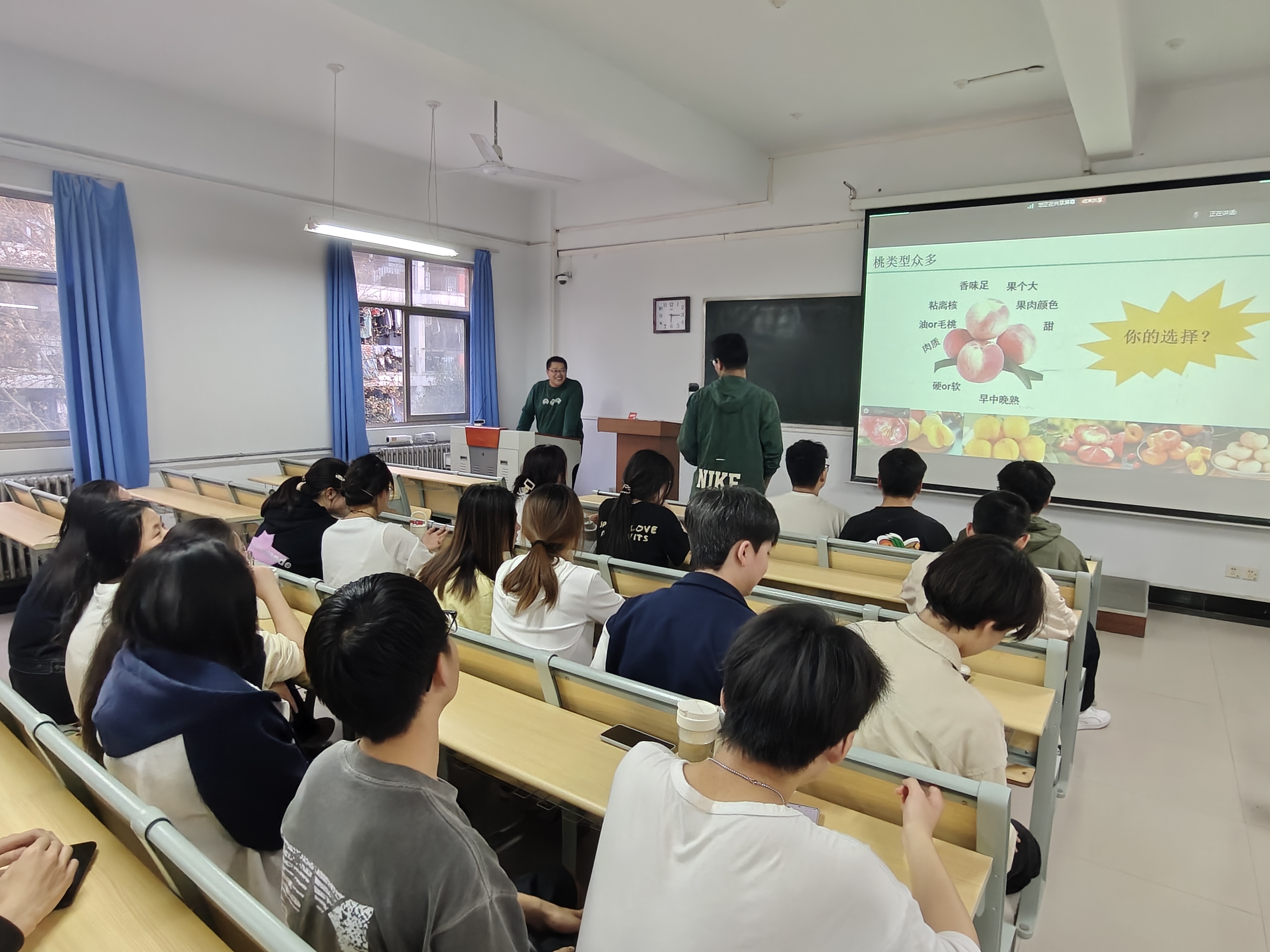 讲座伊始,张海朋抛出 “你心中的桃是什么样的” 这一趣味问题。由于大家喜好各不相同,借此顺利引出桃的种类繁多这一事实。随后,张海朋从历史传承、品种演化、营养价值等多个维度,对桃的生物学特性展开了深入浅出的解析,让学生们对日常熟悉的水果有了全新认识。随后,张海朋结合自身丰富的科研经历,系统阐述了现代生物技术在桃品种改良中的创新应用。他着重介绍了分子标记辅助育种、基因编辑等前沿技术手段,使学生们了解到这些技术在提升桃品质、产量及抗性等方面的巨大潜力。