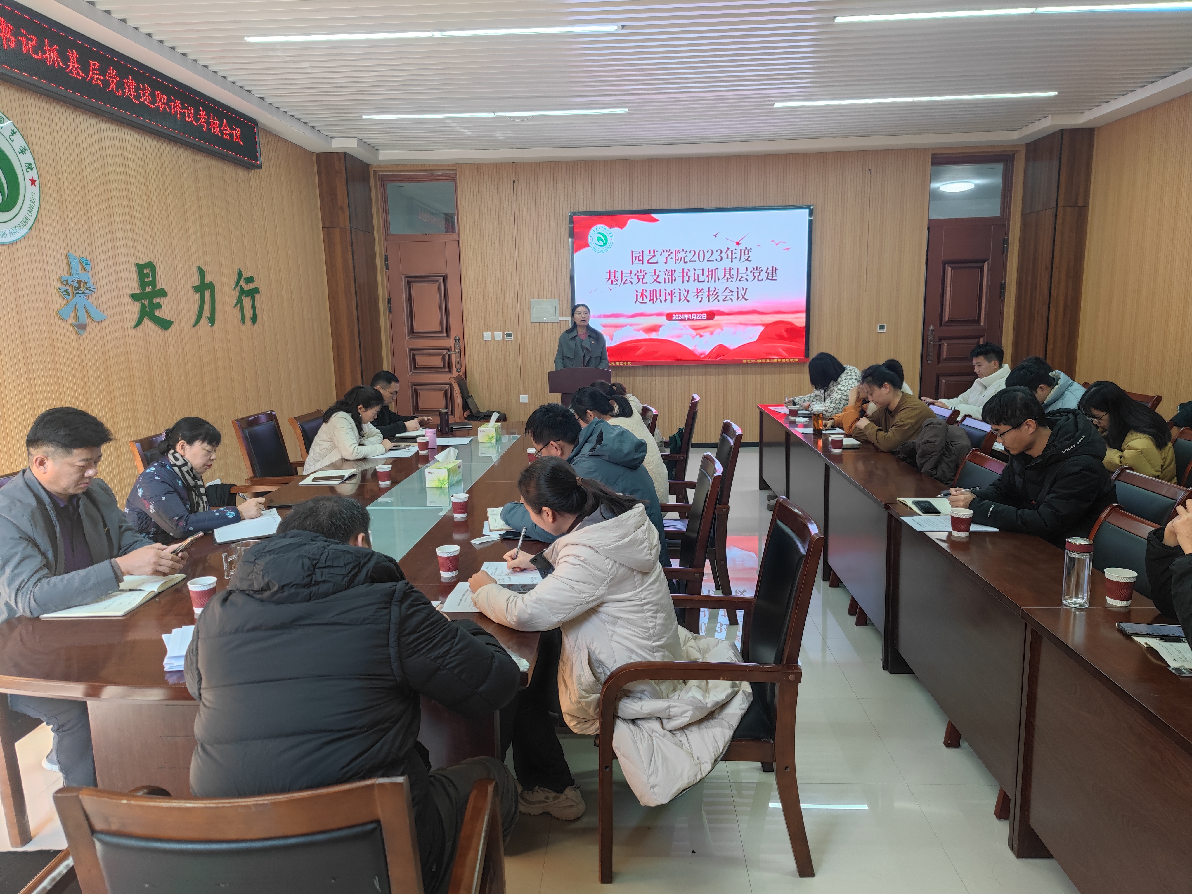 于龙子湖校区第二实验楼北215会议室,召开了2023年度党支部书记抓基层党建述职评议考核会议。院党委书记秦素玲、院党委副书记毛会坡、副院长郑先波、陈广辉、胡建斌以及师生党支部书记、支委参加了会议,会议由院党委副书记毛会坡主持。