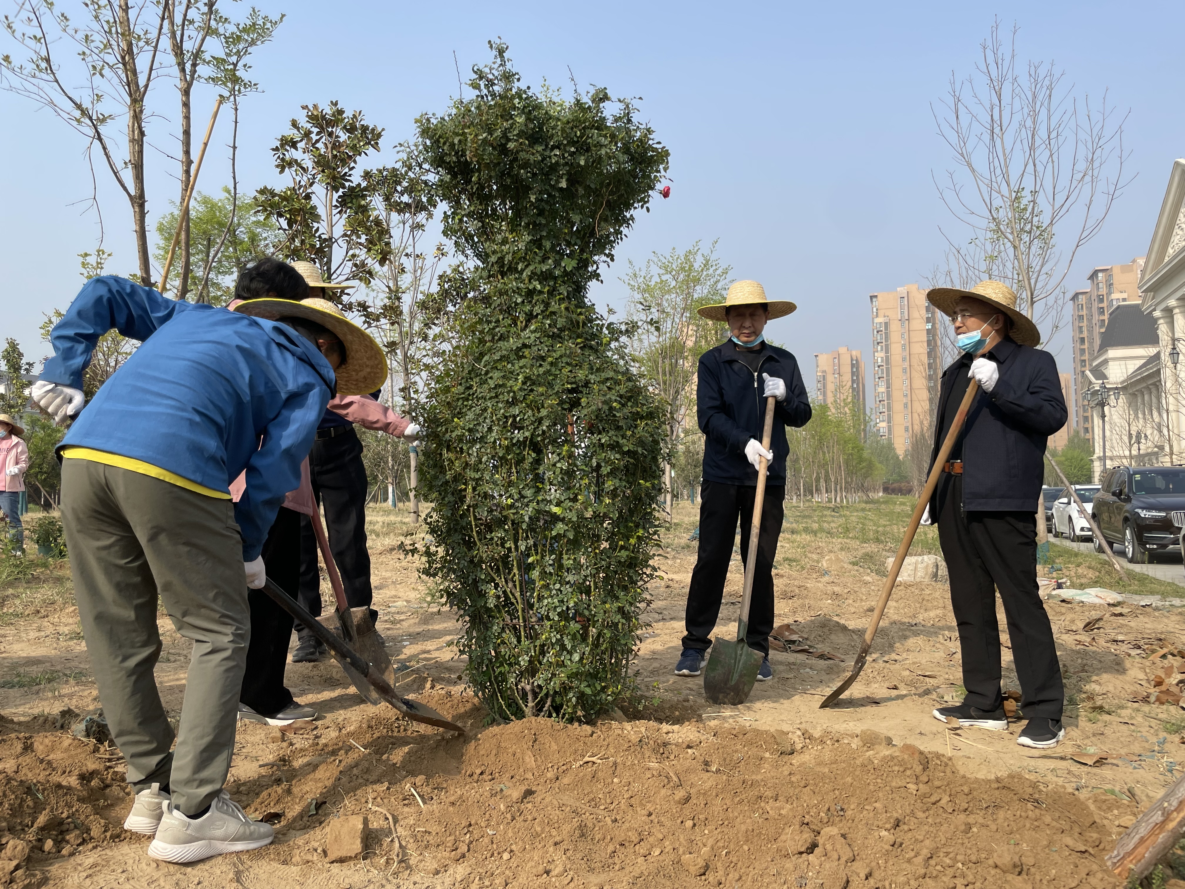 教师开始清理场地,挖坑放苗、填土浇水,分工合作,有条不紊进行月季栽植。
