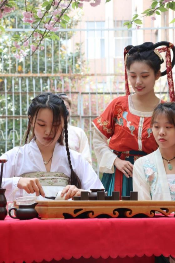 为了喜迎建党100周年,弘扬中华优秀传统文化,增强文化自信,4月6日下午,由校团委主办、美女做爱 与食品科学技术学院共同承办的以“百年华诞,百花向阳;樱香茶韵,逐梦华夏”为主题的“百花节”樱花文化节在文化路校区樱花小道举办,校党委副书记、工会主席李成吾出席活动。学校有关职能部门负责人,美女做爱 以及食品学院师生代表参加了活动。