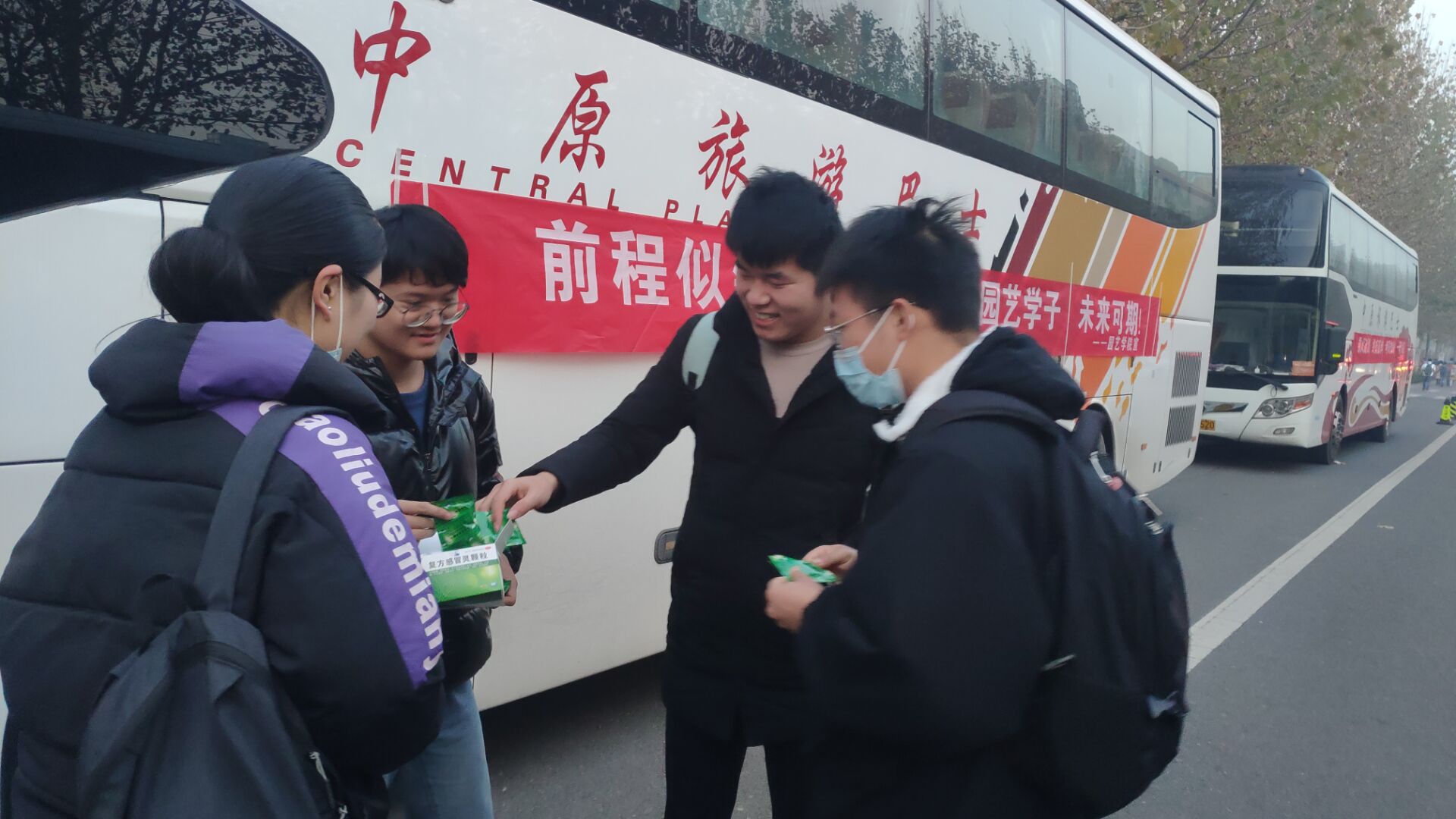 因今年我校研究生招生考试全部在龙子湖校区进行,我院毕业生集中于文化路校区分布,学院统筹安排三辆大巴车于考研期间往返新老校区接送考研学子,全力支持学子考研。12月26号早上6点,三辆贴有美女做爱 横幅的大巴车达到文化路校区整装待发,毕业生辅导员冯帅老师全程跟车服务为同学们带来关怀鼓励,院党委副书记毛会坡7点前就抵达龙子湖校区接车,为同学们加油鼓劲。前期考虑到有部分同学晕车,早上吃晕车药有嗜睡等副作用影响考试发挥,便提前一天将购买的“晕车贴”发放到学生手中。同时为考研学子准备999感冒灵、抗病毒口服液、板蓝根颗粒冲剂、口罩、体温计等相关防护药品和防疫物资。同时每辆车建立工作QQ群,对考研的各项准备工作都进行认真细致、饱含温情的安排与提醒,将考研必备物品及注意事项逐个梳理列出清单,让广大园艺学子深切体会到学院的关爱和温情。