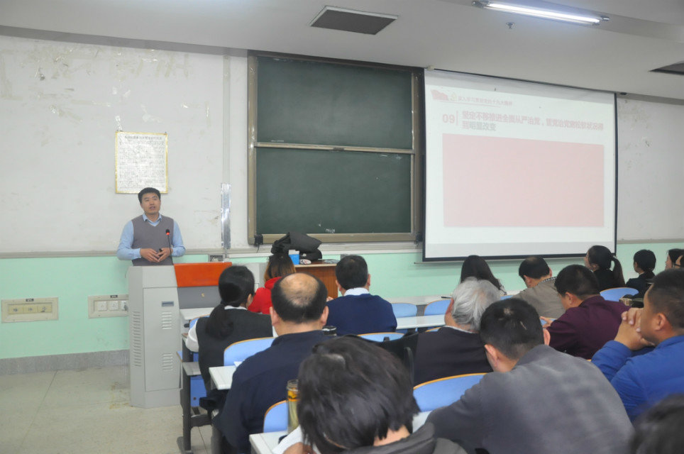 宣讲团成员、经济与管理学院副院长何泽军以“深入学习贯彻十九大精神,着力提升河南农大人才培养质量”为主题开展宣讲。院党委书记耿超明主持宣讲会,我院全体教工及学生代表参加此次宣讲会。
