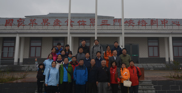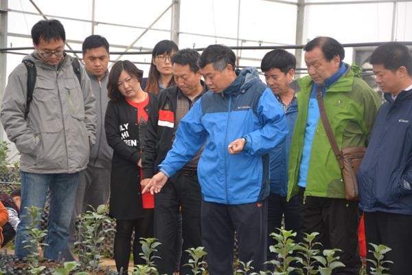 首先,基地技术人员带领我们登上瞭望台,远处层山起伏,近处满园丰收的景象让老师们惊叹不已,红红的大苹果像是育种专家欣喜的笑脸,苹果上晶莹剔透的露珠尤如专家脸上流淌的汗水,硕果累累的枝条折射出品种的优异,株株丰盈的果园透露出基地经营管理的科学。随后到了圃内整形大苗建园示范区,该区内有几棵果树基部膨大突出,明显暴露出砧木和接穗的不亲合现象,专家们形象的将此类果树称之为“大脚树”,院长冯建灿教授耐心地向青年教师讲解了“大脚树”产生的原因、基理以及目前尚在研究的未知领域。在苗圃地,一棵棵高低不平、苗龄不同的苹果苗分别栽植在大小不一的黑色容器中,听冯院长介绍说,这是具有世界先进技术水平、荣获国外专利的果树定植控根容器,具有控制植物根系生长方向和自行与土壤融合变为肥料的特异功能,让一些一直埋头实验室研究的青年教师惊奇不已,不禁感叹:“真是创新无处不在啊!行行都能出状元”。基地的育苗工厂是一排排的日光温室,不同的区域培育着不同品种、不同年龄、不同阶段的苹果苗,山门峡原陕县农业局局长李保安详细地向老师们介绍了苹果矮化砧木控根育苗技术。之后老师们又相继参观了有机肥料的生产加工厂、苹果分级分类包装车间和农业物联网信息监测室,机械化生产和信息化监测调控彰显出我国高山农业现代化的时代气息。苹果采摘园的景象最是欢快热闹,老师们面对个个挂满枝头诱人的大苹果眼花缭乱,手触此,眼望彼,欲摘这个,又看到那个,说不完的赞叹语,听不尽的欢笑声。在此果园,老师们谈的不仅仅是大苹果,而是分子育种与常规育种的结合,想的不单单是辣椒、蕃茄,而是苹果的嫁接技术、包装营销模式在蔬菜方面的应用,不同年龄、不同优势、不同研究方向的老师们聚集在一起,讨论未来科研协同创新大趋势,研究未来园艺作物生产栽培育种方向和园区经营管理新模式,探索依靠科技创新驱动农业发展新途径。
