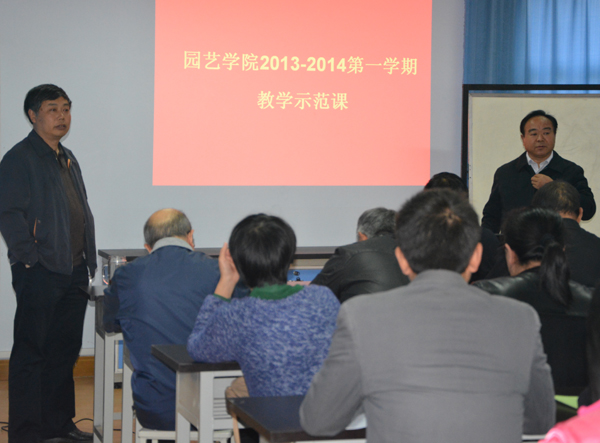 2013-2014第一学期教学示范课讲评活动。教学示范课讲评活动由院长冯建灿主持,教务处副处长化青报,校级教学督导杨明亮,张玉龙应邀参加了讲评活动,教学示范课分别由蔬菜学科带头人孙治强教授和果树学科带头人吴国良教授主讲,学院全体教师和学生参加了讲评活动。