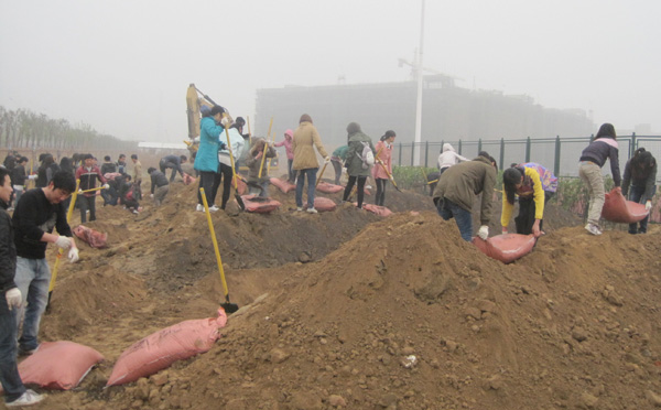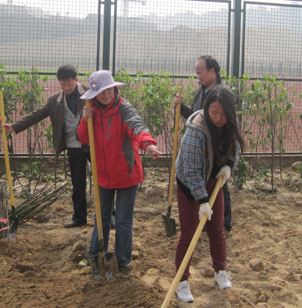 在植树现场,一派热火朝天的劳动场面。党委耿超明书记与师生一起,齐心协力地抬起一袋袋肥料,细心地施肥、垫土、扶苗、培土、浇水,一丝不苟地种下树苗。经过师生们三天的努力,在龙子湖新校区共种植桃、杏、石榴和核桃树800多棵。原本杂乱无章的荒草地,变成了整齐而又美观“桃李园”。