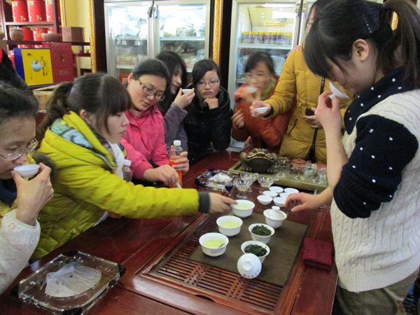 2013年1月6日,我院茶学专业2010级1、2班共51位学生在专业教师刘建军副教授、贺巍博士和梁丽云博士的带领下,前往康师傅控股郑州顶津食品公司、河南省茶叶总公司、郑州国香茶城等地进行专业参观学习和考察。相继参观了康师傅冰红茶、康师傅绿茶、茉莉花茶等茶饮料及果汁饮料的生产加工线和袋泡茶加工厂、少宇八颗草降酸茶生产车间,学习了红、绿袋泡茶及少宇八颗草降酸茶加工工艺,之后又到曦瓜大红袍茶行、御馨茗茶、明君子茶业、君山茶业等近20多家茶业销售门店进行参观考察。