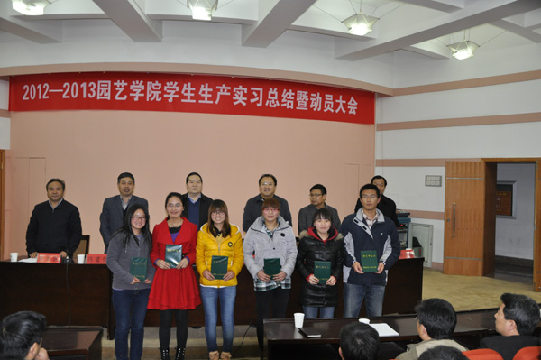 关于授予崔攀攀等82人合格园艺师的决定》,与会领导为合格园艺师代表颁发证书。副院长孙治强在总结2012年学生生产实习经验和教训的同时,又对2013年的生产实习进行安排部署。孙院长指出,作为“卓越园艺师培养计划”的重要环节,2012年生产实习举全院之力,获得了圆满成功。学生不辞辛苦,战酷暑、耐严寒,提高了动手实践能力,提升了社会责任感,实习老师认真负责,帮助学生解决生产、生活问题。在即将开始的2013年生产实习中,希望参加实习的学生按时按量完成任务、服从统一安排管理、认真记录实习日志、例行请假手续并注意劳动保护及自身安全保护。