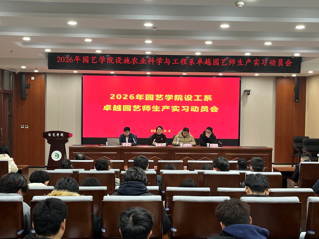 设工系在龙子湖校区力行楼北209会议室召开“卓越园艺师”生产实习动员会。院党委书记郭娟、系教学主任李阳、系科研主任王永、实习指导老师及全体实习生参加,会议由设工系主任肖怀娟主持。