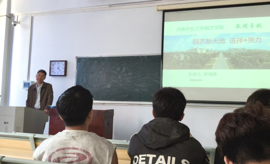 第43期“教授导航”专题活动在桃西201教室顺利举办。本次活动由果树系教授宋尚伟老师担任主讲,以“园艺新天地,选择+努力”为主题开展专业分享,活动由班主任申亚文老师主持。