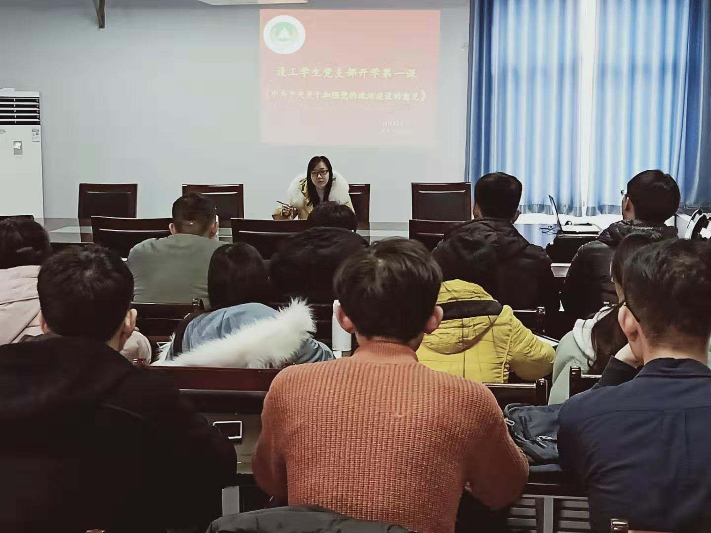 2019年2月28日,园艺院设工学生党支部在文化路校区2号楼413组织了“开学第一课”。此次党课由党支部书记黄婉珺老师主讲,参加学习的有16、17级设工专业的党员和积极分子。