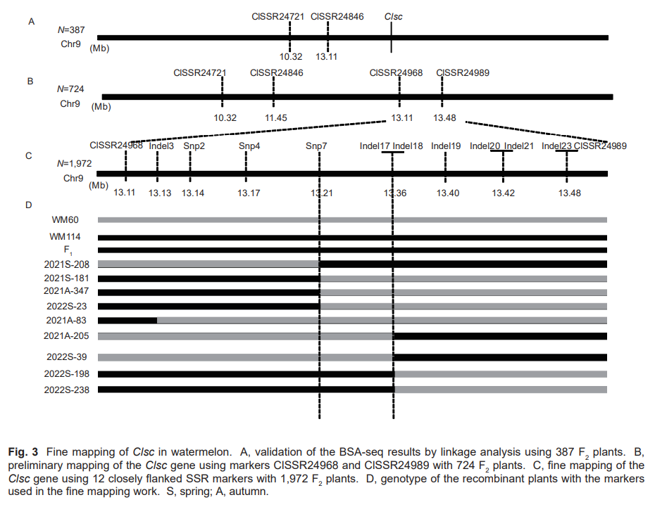 遗传分析结果表明,WM60的浅色条纹性状由一对隐性基因控制,命名为Clsc。随后。通过构建F2群体基因混池和连锁分析的方法,将控制西瓜果皮条纹颜色基因定位到9号染色体上一个147.6 kb区间内。结合基因组重测序、转录组测序、表达量分析、结构变异分析和基因功能注释等信息,将Cla97C09G175150基因选定为候选目的基因。