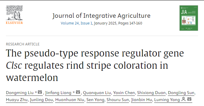瓜类种质遗传改良与分子育种课题组完成的题为“The pseudo-type response regulator gene Clsc regulates rind stripe coloration in watermelon” 的研究在Journal of Integrative Agriculture (《农业科学学报》(英文),JIA) 2025年1期正式发表。
