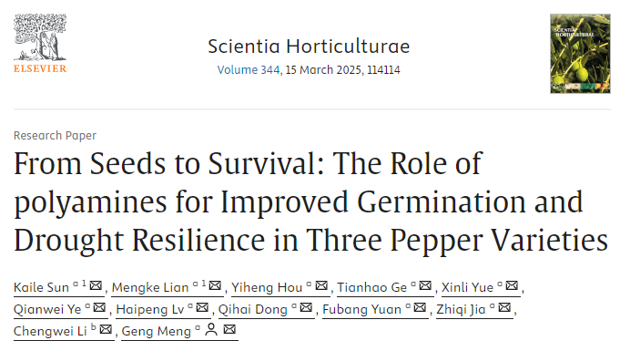 茄科抗病抗逆种质创新研究团队在园艺学领域权威期刊《Scientia Horticulturae》上发表了题为“From Seeds to Survival: The Role of Polyamines for Improved Germination and Drought Resilience in Three Pepper Varieties”的研究论文。该研究首次系统揭示了外源多胺(亚精胺、精胺等)对辣椒种子萌发及幼苗抗旱性的调控机制,明确了不同品种的优化浓度阈值,为干旱胁迫下的辣椒栽培提供了创新性解决方案,对提升作物逆境适应能力、保障农业生产具有重要应用价值。