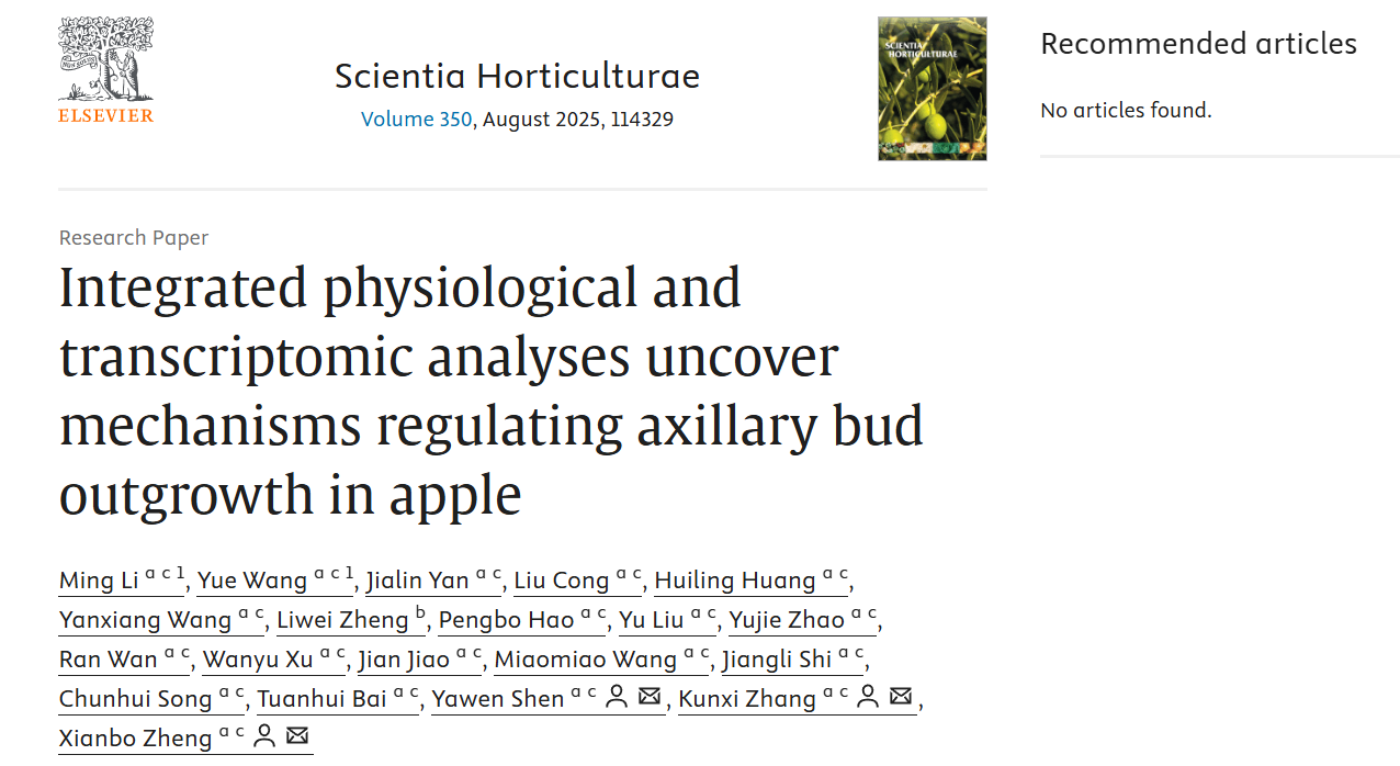 苹果逆境生物学与简约栽培技术体系研究团队在国际知名期刊Scientia Horticulturae(中科院2区TOP,IF 4.2)上发表了题为“Integrated Physiological and Transcriptomic Analyses Uncover Mechanisms Regulating Axillary Bud Outgrowth in Apple”的研究论文,在苹果苗木分枝机理研究方面取得了新的进展。