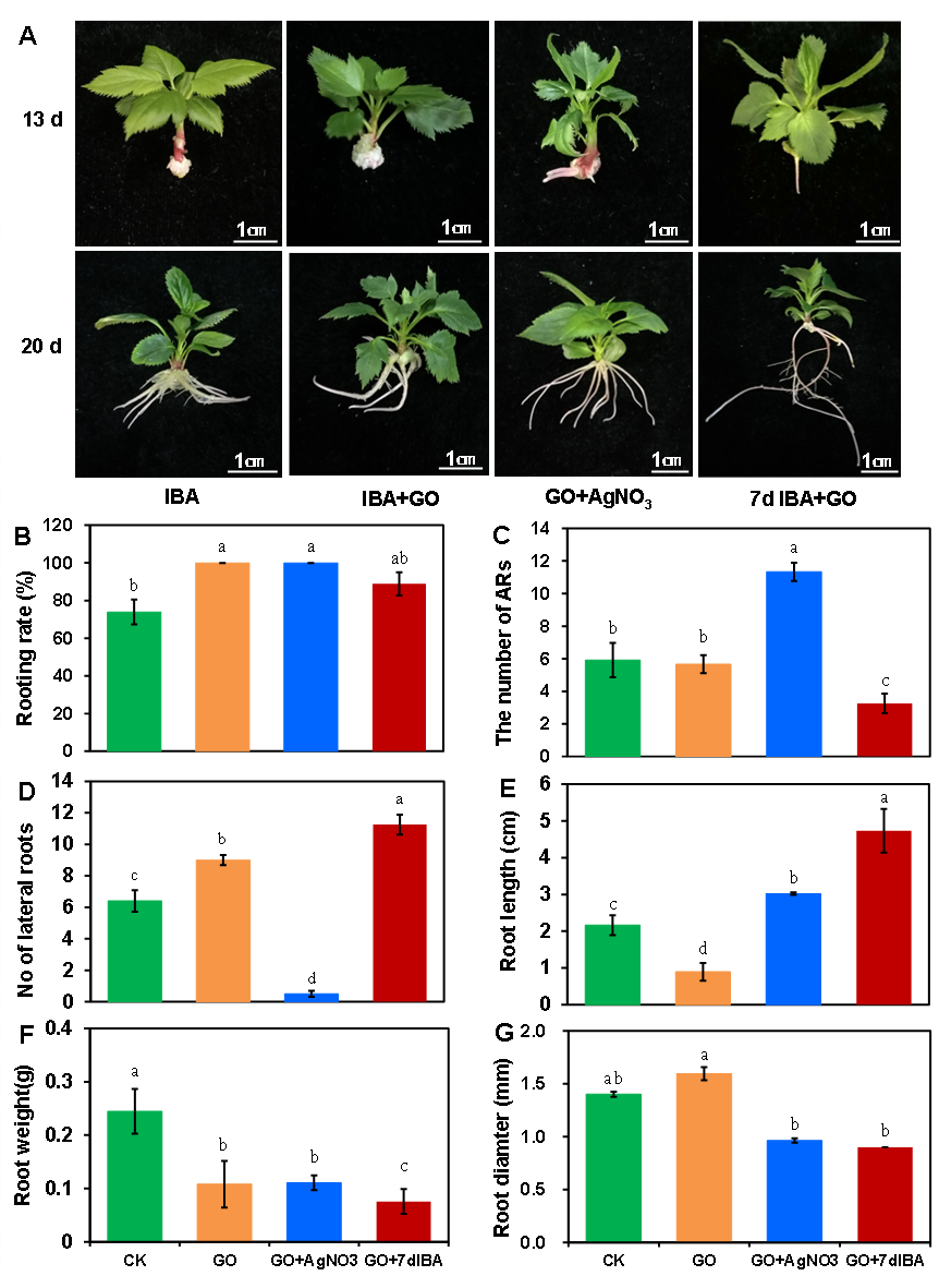 苹果是世界上最重要的水果作物之一,在全球广泛种植。砧木在苹果树的生长发育和抗逆性中起着重要作用。M9-T337是一种优良的矮秆砧木品种,在苹果栽培中广泛用作砧木,但M9-T337在无性繁殖时生根能力较差,成为制约苹果矮化砧木和优质大苗繁育的重要难题。氧化石墨烯(GO)是一种新型纳米材料,具有体积超小、形状独特、理化性质独特等特点,广泛应用于各个领域。本研究发现在0.1 ~ 1.0 mg/L浓度范围内,氧化石墨烯促进AR形成,抑制根系伸长。GO与吲哚-3-丁酸(IBA)协同可提高苹果砧木的生根率和侧根数。与IBA处理相比,IBA+GO处理提高了乙烯产量,并增强了乙烯合成基因MdACO1和MdACS2以及乙烯信号转导基因MdEIN3的表达。此外,GO改变生长素转运基因的表达。IBA+GO处理显著提高了AR再生基因MdLBD29和MdWOX11以及细胞周期基因MdCYCD3的表达。这些结果表明,GO与IBA的相互作用调节了苹果砧木AR的形成和发育。