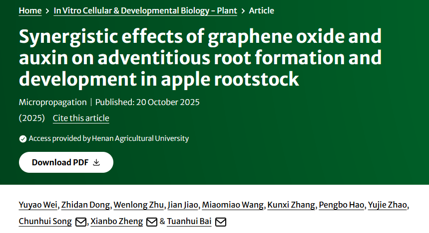 苹果逆境生物学与简约栽培技术团队在In Vitro Cellular & Developmental Biology-Plant发表题为“Synergistic effects of graphene oxide and auxin on adventitious root formation and development in apple rootstock”的研究论文,揭示了IBA和GO协同调控苹果砧木不定根形成和生长的机制,为苹果无性系矮化砧木的繁育提供理论指导。