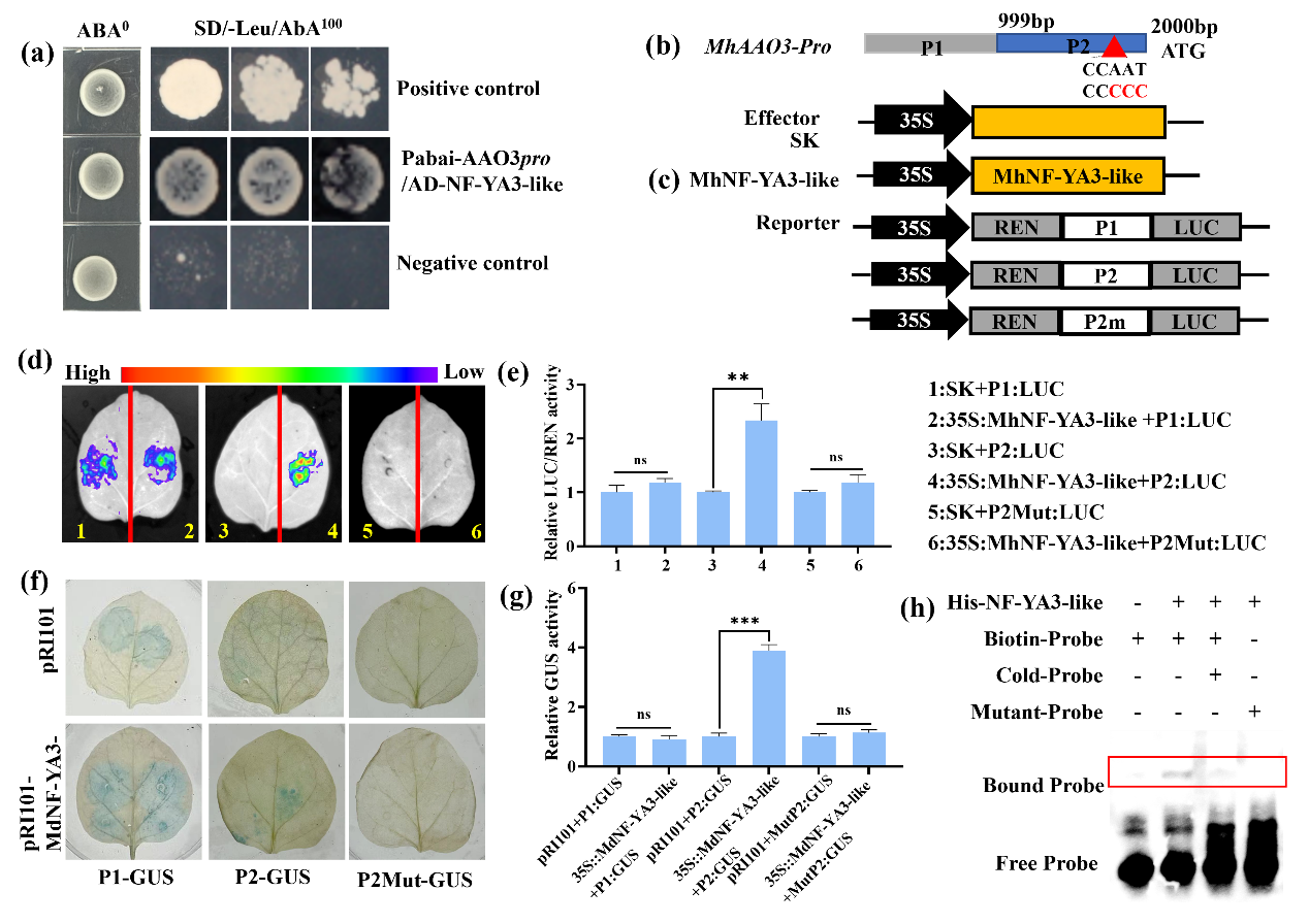 通过酵母双杂(Y2H)文库筛选,鉴定到MhNF-YA3-like直接互作蛋白MhMSI4-like,通过Y2H、BiFC、LCI及Co-IP证实了MhNF-YA3-like与MhMSI4-like在细胞核内特异性互作。此外,研究人员对ABA合成代谢通路的主要基因进行了RT-qPCR分析,其中AAO3在干旱胁迫下表达显著上调。Y1H、LUC、GUS活性及EMSA进一步确定了MhNF-YA3-like作为转录激活因子,通过结合并激活MhAAO3的表达(Fig. 2)。