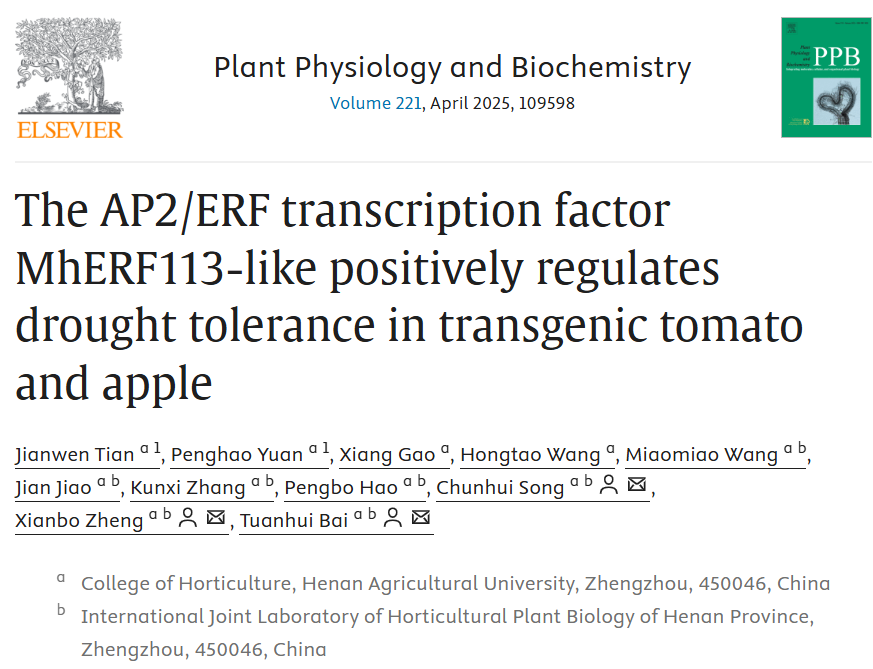 MhERF113-like positively regulates drought tolerance in transgenic tomato and apple”的研究论文,转录因子