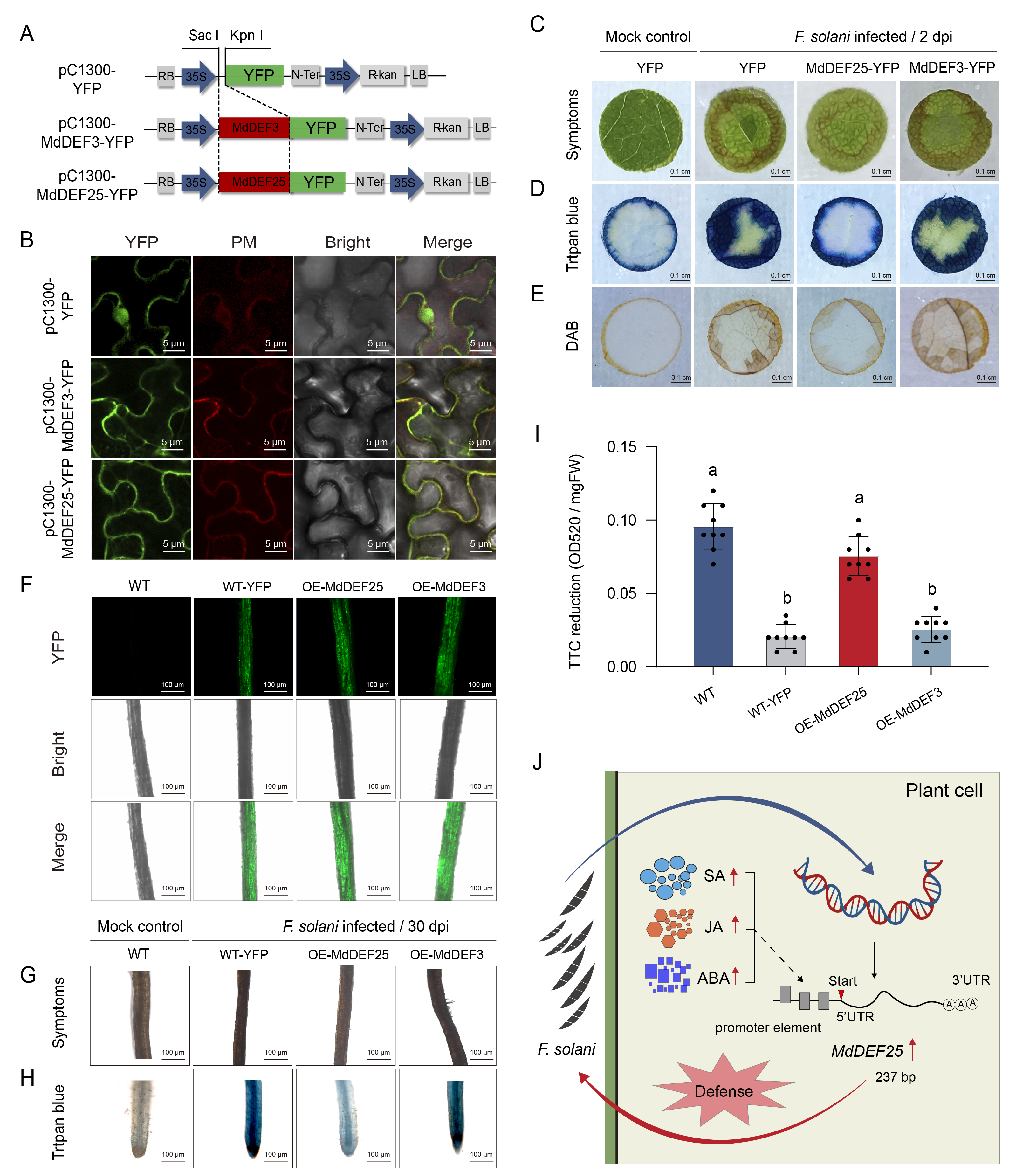 文章链接:Genome-wide investigation of defensin genes in apple (Malus×domestica Borkh.) and in vivo analyses reveal that MdDEF25 confers resistance to Fusarium solani - ScienceDirect