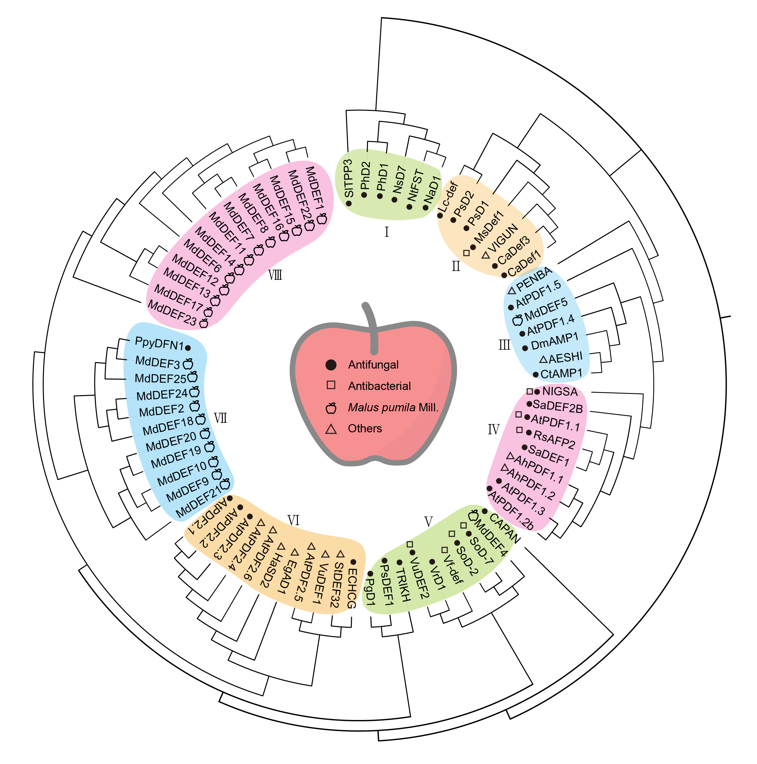 F. solani)作为主要病原菌之一,严重破坏了果园土壤生态系统的结构和功能,抑制了苹果树的生长发育,影响其产量和品质。防御素是一类重要的抗菌肽,广泛分布于动植物中,是生物免疫系统中的重要调节分子。然而,目前对于苹果防御素的鉴定及其对