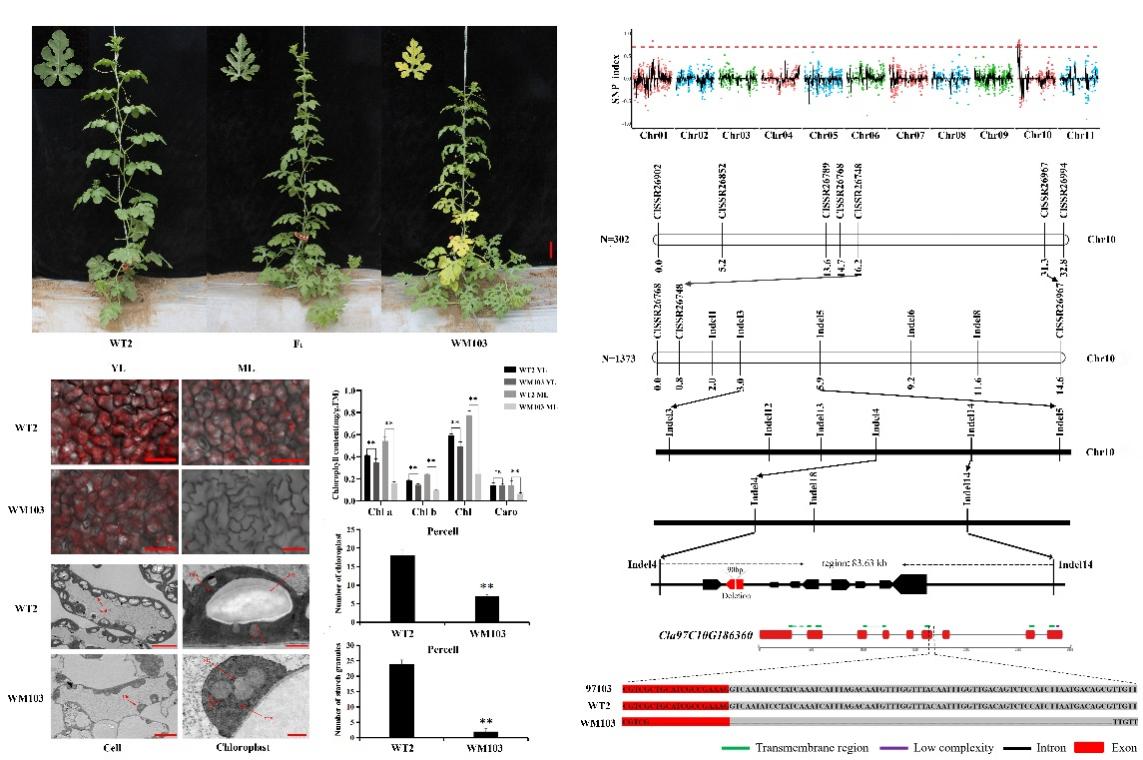 研究团队利用“Royal Golden”衍生自交系WM103与正常材料WT2构建F₂分离群体,结合课题组自主开发的5K西瓜液相芯片进行BSA-seq分析,将候选基因初步定位在10号染色体上。进一步通过分子标记将区间缩小至86.63 Kb,最终确定该基因编码一个BALANCE OF CHLOROPHYLL METABOLISM(ClBCM)蛋白。为验证其功能,研究人员采用VIGS和CRISPR/Cas9基因编辑技术,分别对ClBCM进行瞬时沉默与稳定敲除。结果表明,无论是沉默株系还是敲除突变体,均表现出典型的早衰表型,叶绿素含量和光合能力均显著下降,表明ClBCM在维持叶绿素稳态和延缓衰老中发挥着重要作用。同时确认与衰老相关的WRKY转录因子家族的多个基因在早衰突变体中差异表达,进一步通过实验验证发现正向调控衰老的转录因子ClWRKY53可直接结合ClBCM的启动子调节其转录。此外,蛋白互作分析发现ClBCM与ClSGR存在直接互作,协同调控体内叶绿素稳态。