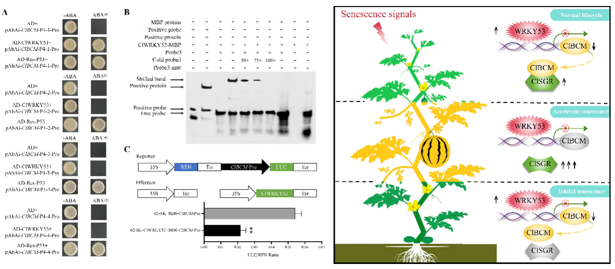 瓜类种质遗传改良与分子育种课题组在Horticultural Research(中科院1区Top,IF=8.5)发表了题为“The ClWRKY53-ClBCM/ClSGR module controls plant senescence via chlorophyll degradation in watermelon”的研究论文。该研究克隆了首个西瓜衰老调控基因,并系统解析了其分子调控网络,显著增进了对西瓜衰老调控网络的理解。
