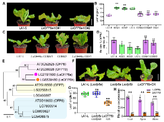 CRISPR/Cas9敲除LsOFP6a基因使小叶夹角植株转变为大叶夹角;而转基因遗传互补可让大叶夹角植株恢复紧凑株型。同源基因LsOFP6b与LsOFP6a的功能相似,但自然表达量低,无法弥补LsOFP6a的功能缺失,而人工过表达可挽救大叶夹角表型,进一步验证了LsOFP6负调控生菜叶夹角的功能(图2)。