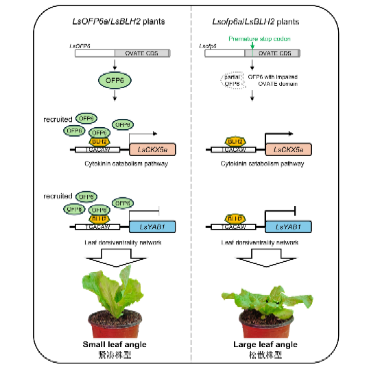 进一步研究表明,LsOFP6a与LsBLH2转录因子蛋白互作且抑制其转录调控功能。一方面,LsOFP6a抑制LsBLH2对LsCKX5的转录激活,进而提高细胞分裂素水平以减小叶夹角;另一方面,LsOFP6a解除LsBLH2对LsYAB1的转录抑制,促进远轴细胞伸长,让叶片更直立。两条路径协同作用,最终实现生菜叶夹角的精准调控(图3)。