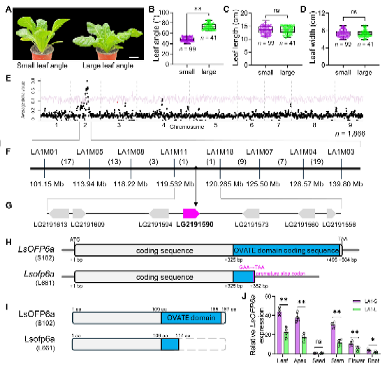 本研究通过BSR-seq技术图位克隆了2号染色体的叶夹角调控基因LsOFP6a。序列分析发现,大叶角植株的LsOFP6a基因存在无义突变,导致蛋白质翻译提前终止,OVATE结构域受损。LsOFP6a基因主要在叶片、茎尖和茎中表达,且在小叶夹角植株中表达量更高(图1)。