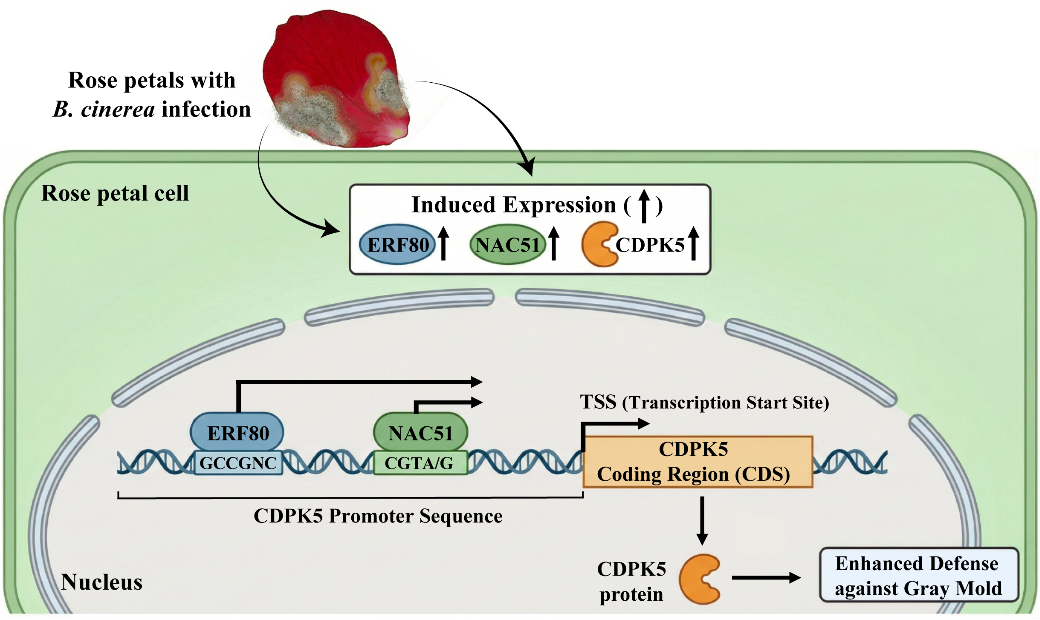为进一步验证其抗病功能,研究人员利用病毒诱导的基因沉默(VIGS)技术在月季花瓣中敲低了 RcCDPK5 的表达,结果表明沉默该基因会显著增加花瓣对灰霉菌的敏感性,证实了 RcCDPK5 是介导月季对灰霉菌抗性的关键正向调控因子。 本 研究深入解析了 RcCDPK5 的上游转录调控机制 , 研究证实了转录激活因子RcNAC51和RcERF80能够直接结合到 RcCDPK5 的启动子区域,并激活该基因的转录表达。这一RcERF80/RcNAC51- RcCDPK5 转录调控级联通路的阐明,不仅为理解蔷薇科植物 CDPK 介导的免疫防御提供了全新的理论基础,也为培育高抗灰霉病的月季新品种提供了重要的基因靶点与科学依据。