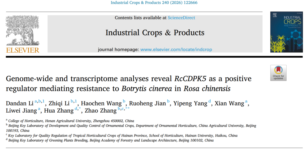 观赏植物种质创新及应用团队 立足于优势特色观赏植物的产业,重点围绕月季等重要花卉在生产与采后流通过程中存在的病害瓶颈问题,瞄准科研前沿开展深入研究。近日,该团队在 Industrial Crops Products 发表了题为“Genome-wide and transcriptome analyses reveal RcCDPK5 as a positive regulator mediating resistance to Botrytis cinerea in Rosa chinensis ”的研究论文。该研究系统揭示了钙依赖性蛋白激酶( CDPK )家族成员在月季抵御灰霉菌( Botrytis cinerea )侵染中的核心调控网络与分子机制。