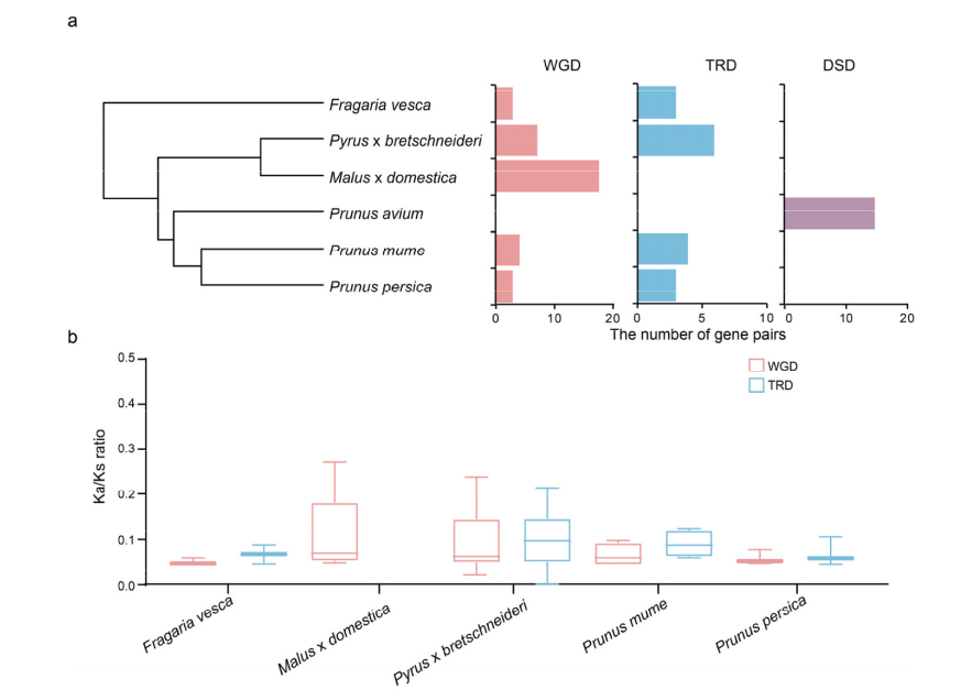 面对这一产业难题,研究团队另辟蹊径,将研究视角聚焦于植物特有的LSH转录因子家族。通过生物信息学分析,在苹果、梨、草莓、桃、梅和樱桃等6种蔷薇科物种中系统鉴定了60个LSH基因成员,发现全基因组复制和转座复制是驱动该基因家族扩张的主要动力。其中,苹果中的18对WGD来源的MdLSH基因经历了强烈的纯化选择,显示出高度的进化保守性。