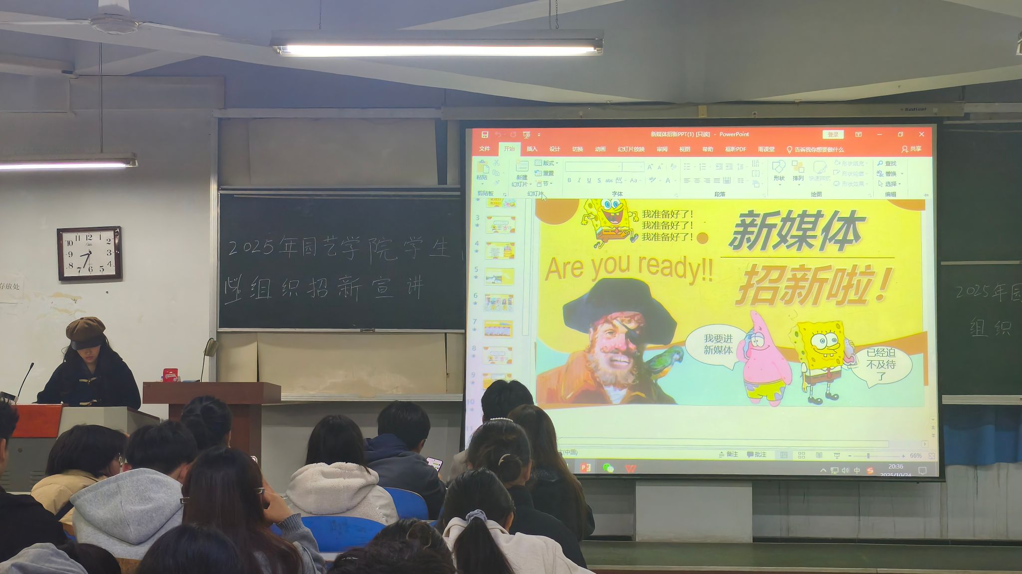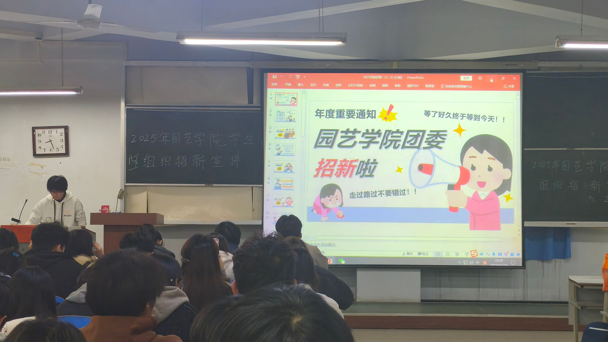 在桃李园学生公寓桃西楼604开展学生组织招新见面活动,全体2025级新生参加。